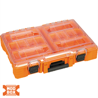 Klein Tools MODbox™ Tall Component Box, Full Width comes with 8 removable storage bins and a stay-put lid design to keep contents from shifting. The clear lid provides an easy view of contents such as wire nuts and fasteners. Component box is IP65 rated and made with impact resistant polymers. Easily connects with other MODbox™ components to make a custom mobile workstation.