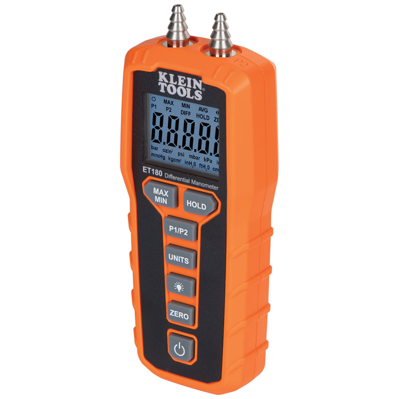 The ET180 Digital Differential Manometer from Klein Tools measures air and gas pressure for port 1, port 2, and measures the differential between the ports. Easily toggle between units: inH2O, bar, oz/in2, psi, mbar, kPa, inHg, mmHg, kg/cm2, ftH20, and cmH2O. Large, backlit LCD shows minimum, maximum and average values. Magnet on back for hands-free operation