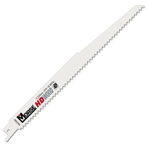 Morse RB93506T05 (400176), 9" x 6 tooth, bimetal reciprocating saw blade is specifically designed for cutting all types of wood, nail-embedded wood and wood composites. Tapered blade body eases the ability to plunge cut. Reinforced tooth profile resists premature tooth strippage in nail-embedded wood applications. Standard .035" blade thickness provides flexibility to reach tight spaces. Five (5) blades per pack.