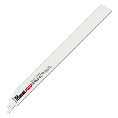 Morse RBWP124214T25 (392150), 12" x 14TPI, bimetal reciprocating saw blade is designed for cutting metal, from 1/8", up to 3/8", thickness. Wider, thicker blade body reduces blade deflection, increases rigidity, under heavier feed pressure. Twenty five (25) blades per pack.